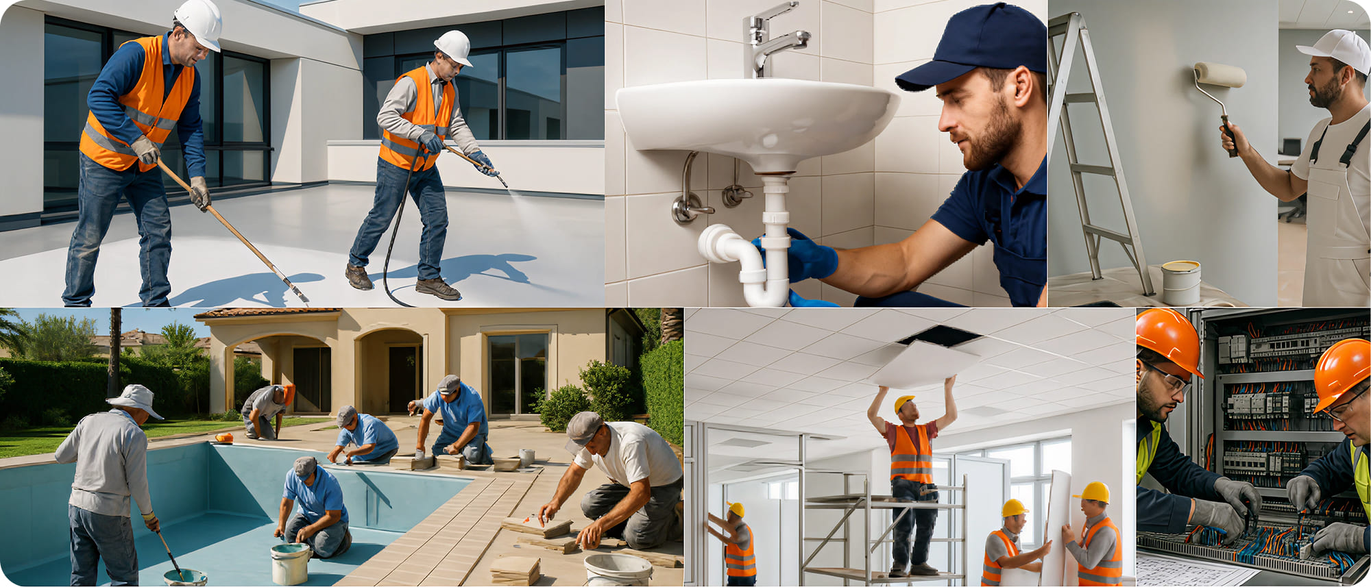 swimming pool construction, plastering, painting, partitioning, and sanitary